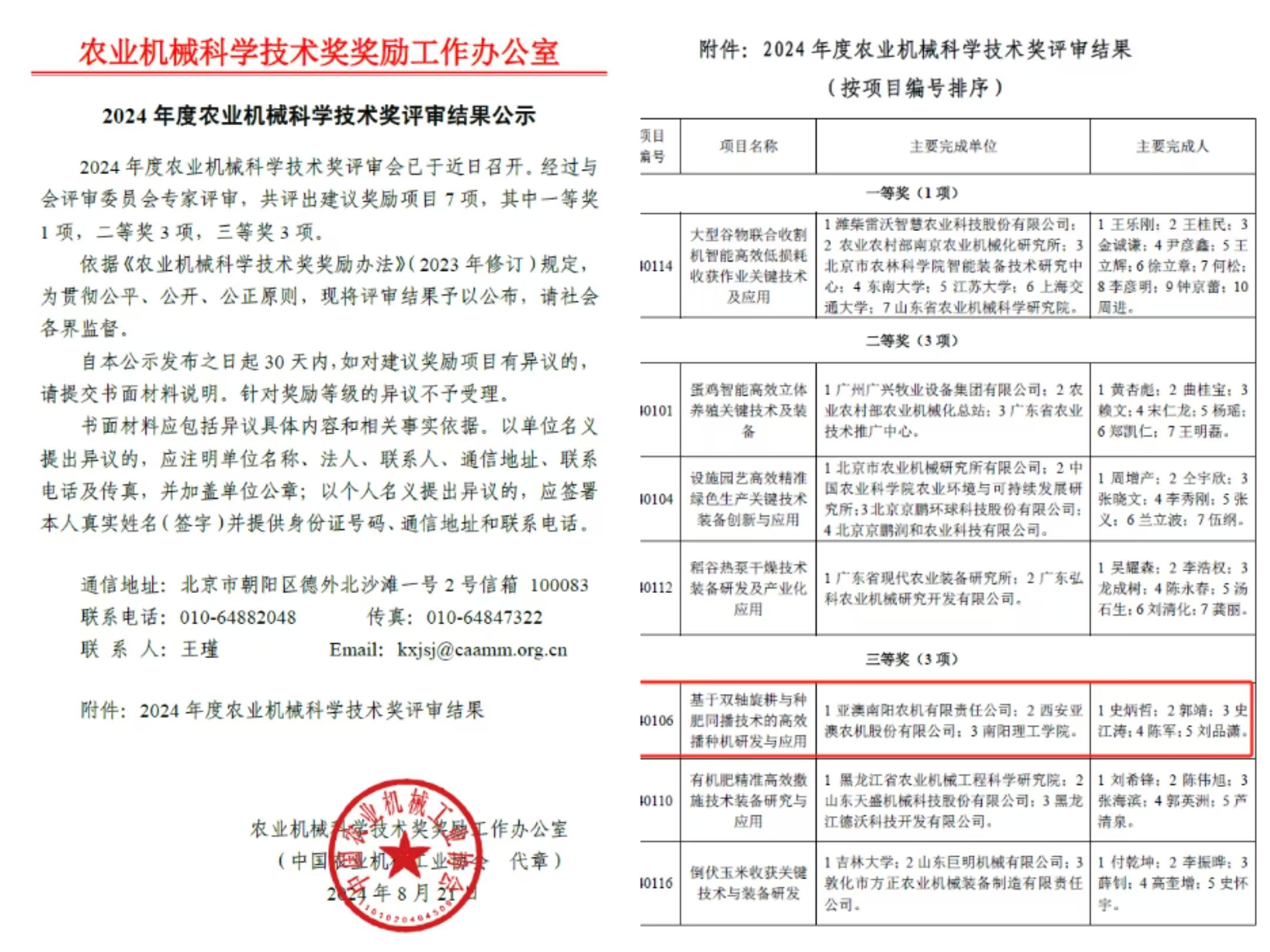 在科技與農(nóng)業(yè)深度融合的時代浪潮中,一則振奮人心的喜訊傳來 ——亞澳農(nóng)機成功榮獲農(nóng)業(yè)機械科學技術(shù)獎!